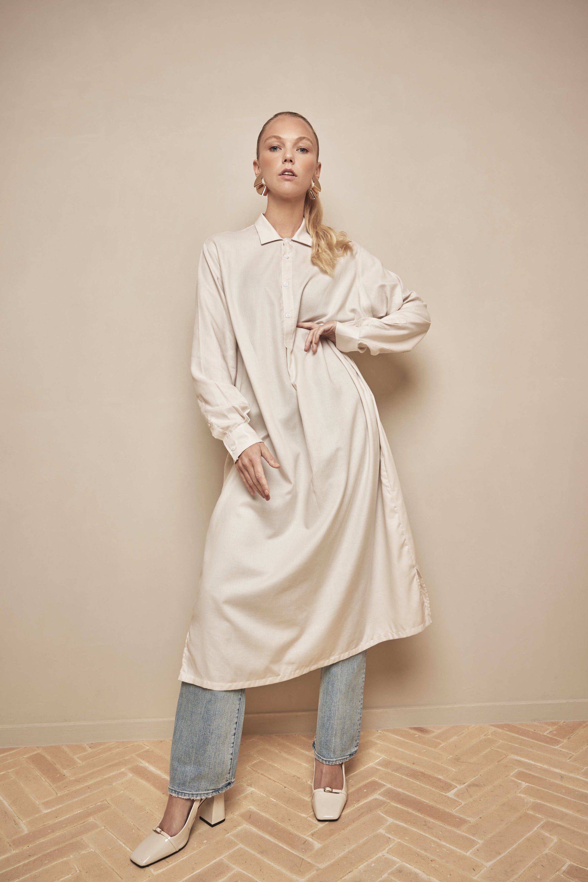 Oversized beige shirt dress. A casual yet polished outfit ideal for layering and everyday wear.